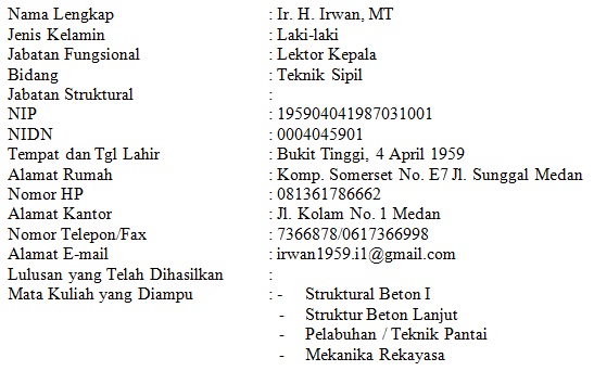 Profil Ir. H. Irwan, MT Identitas Riwayat Pendidikan Riwayat PekerjaanMatakuliah – Struktur Beton Lanjut – Mekanika Rekayasa III